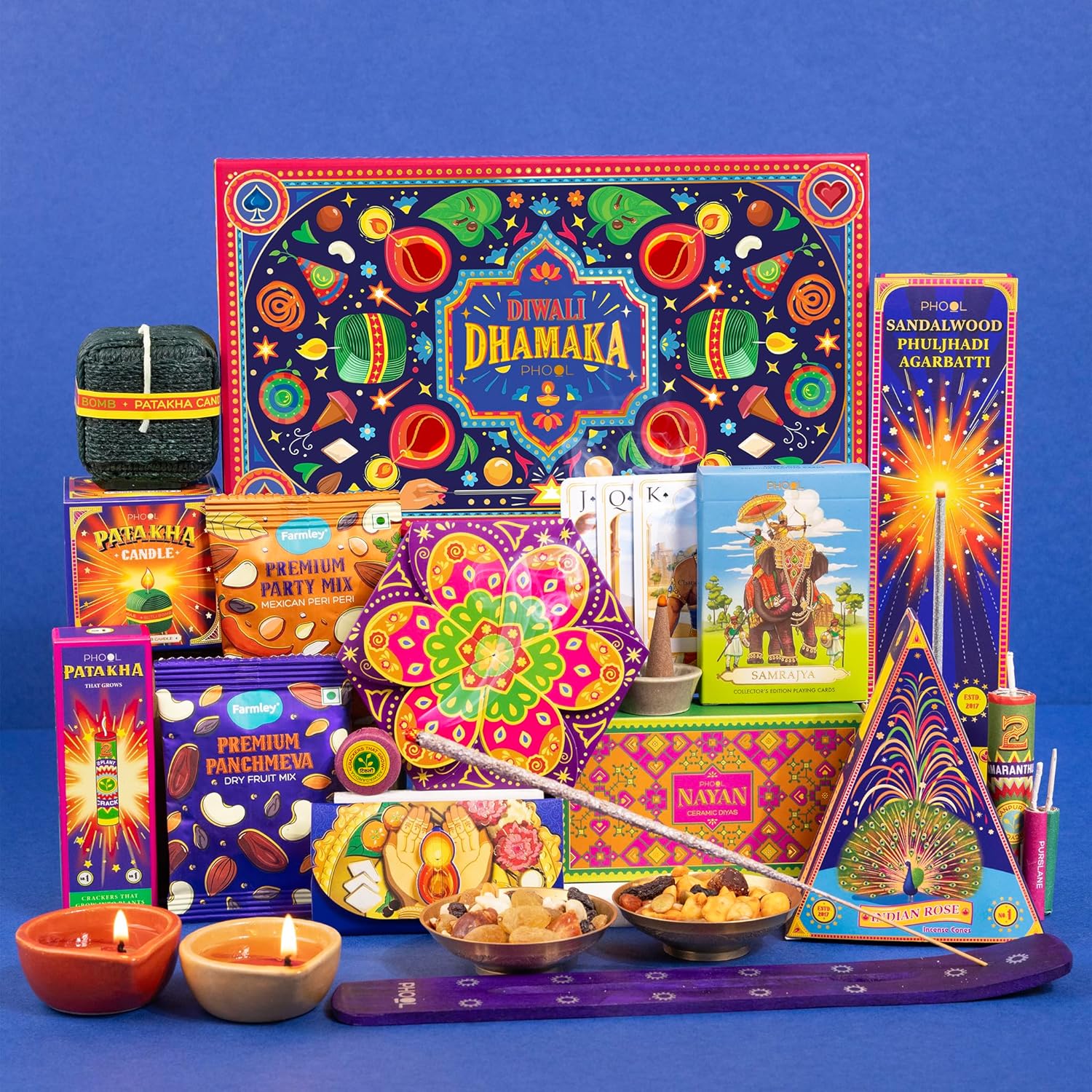 Phool Diwali Dhamaka Gift Box | 11 Premium Festive Items | Dry Fruits and Nuts, Playing Cards, Candle,agrabrbatti, diyas, Fun & Traditional Diwali…